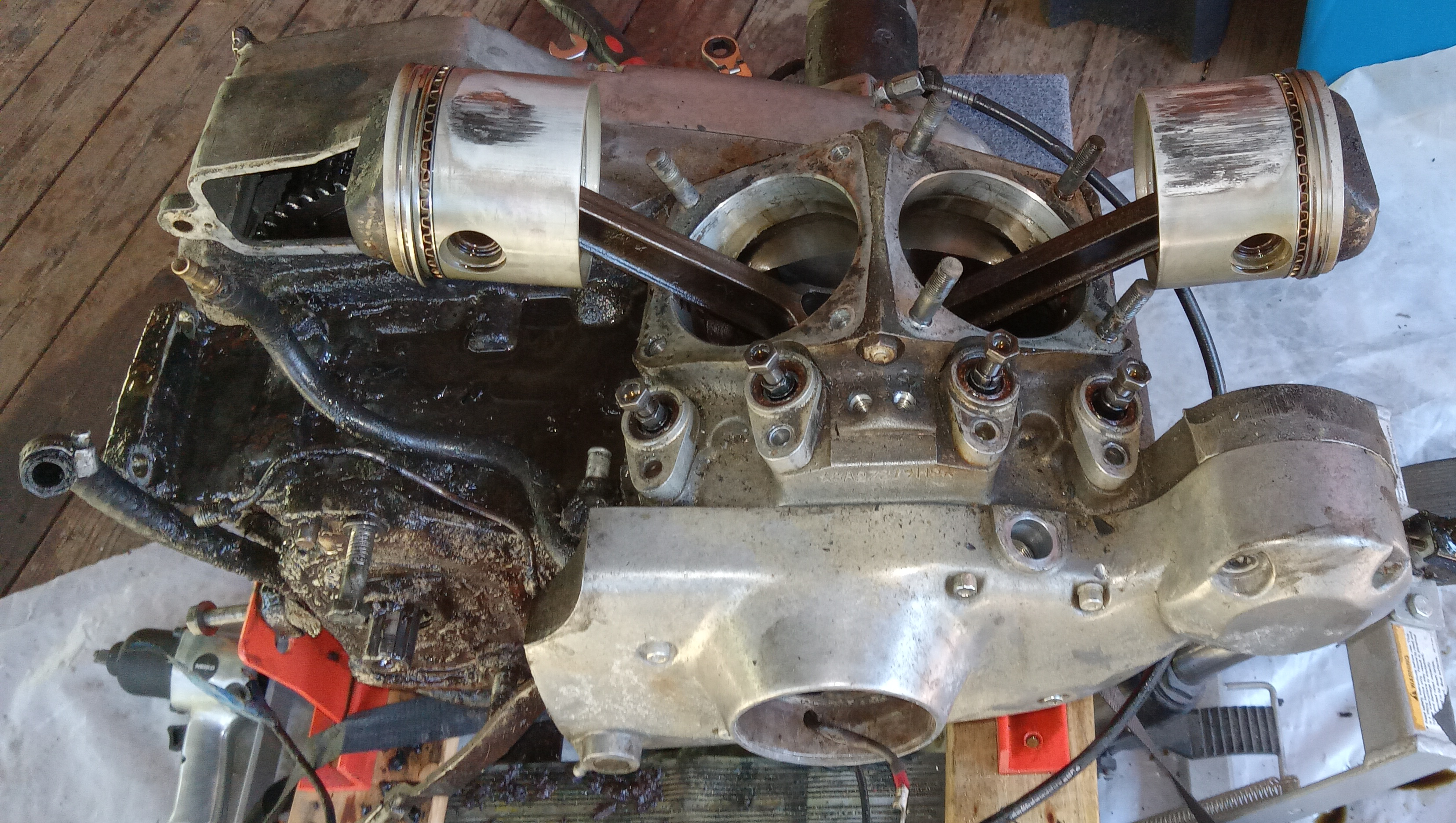 Once out and cracked open, the engine emitted a rotten smell as if it had been submerged in stagnant water for a time. The rear of the cases was covered in an oily gooey mess.